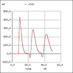 この反射がどの程度のものか、図1の回路と典型値の組み合わせで 出力インピーダンス 50Ωの方形波発信器の出力を観測するケースを spiceでシミュレートしてみた結果が図2です。(注3)